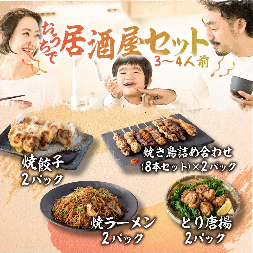 居酒屋のんちゃんで人気の『焼ギョーザ・焼ラーメン・とり唐揚・焼き鳥』がどっさりと入ったおうちで居酒屋セット。